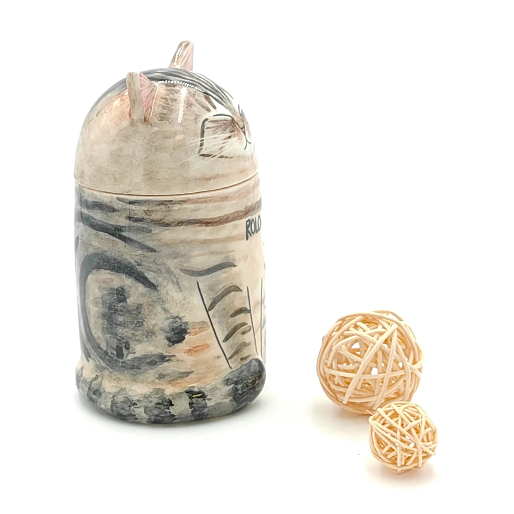 The urn or box has a cylindrical shape, and the lid corresponds to the cat's head in the shape of a hemisphere, so that the opening is the most appropriate to the design. The urn features the cat's face and fur, giving special prominence to these two details, the paws are painted and the tail is modeled. If you want, we can add a name or a date to the urn or both or any short phrase you prefer.